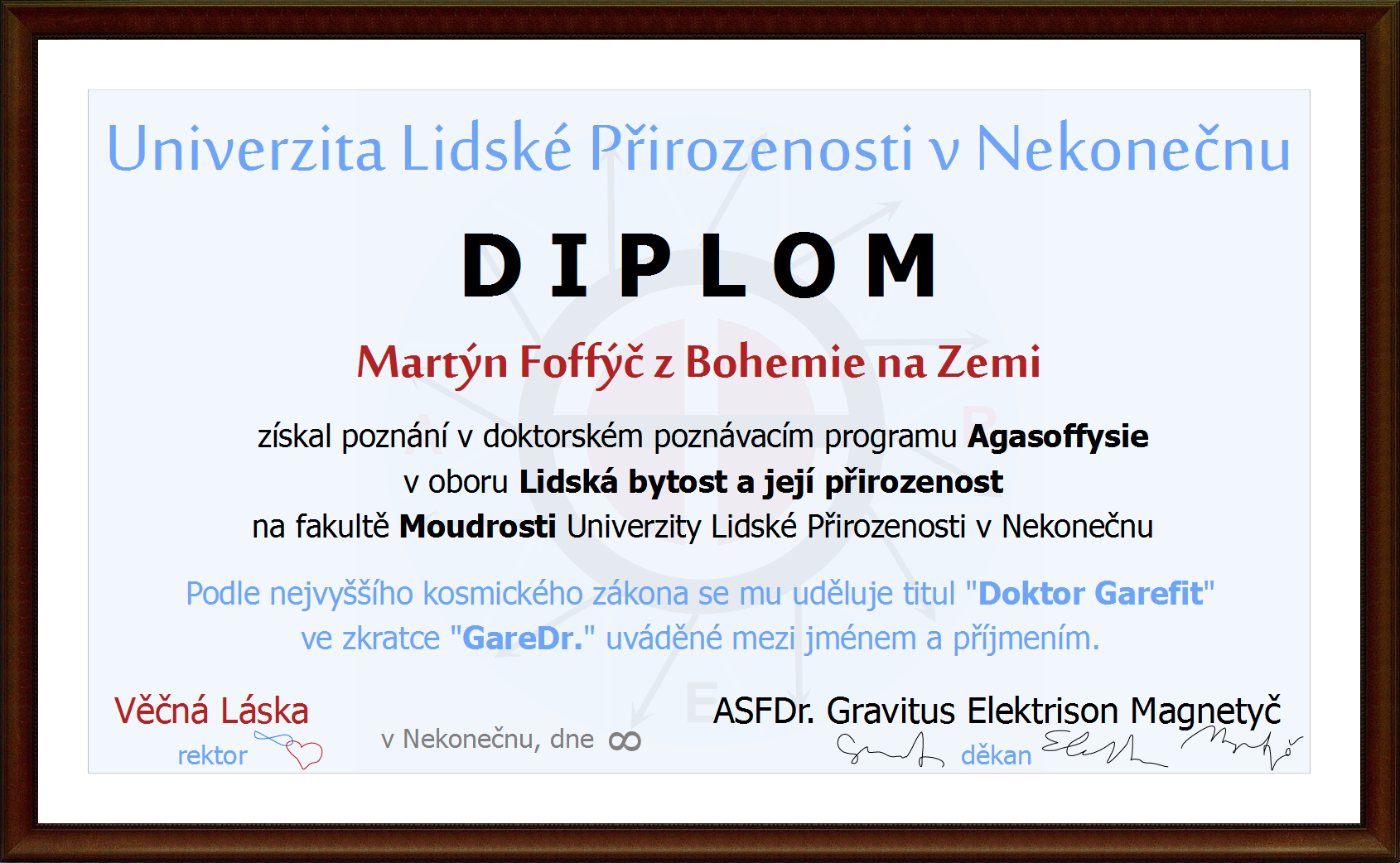Mezi lidskými bytostmi znám jako Martin Foff, v kosmu je oživující paprsek vědomí prohlášen jako Martýn Foffýč z Bohemie na Zemi, absolvent fakulty Moudrosti na Univerzitě Lidské Přirozenosti v Nekonečnu s titulem GareDr. Projekt Garefit je součástí jeho doktorské obhajoby na uvedené kosmické univerzitě právě otevírající zcela nový poznávací program nesoucí název Agasoffysie, který znamená: s láskou zkoumá moudrost přirozenosti. Doktorský diplom opravňující k vykonávání „Průvodce vnitřní proměnou a uvedením do souladu dle moudrosti přirozenosti“ je možno stáhnout zde – nadhled nutný 🙂